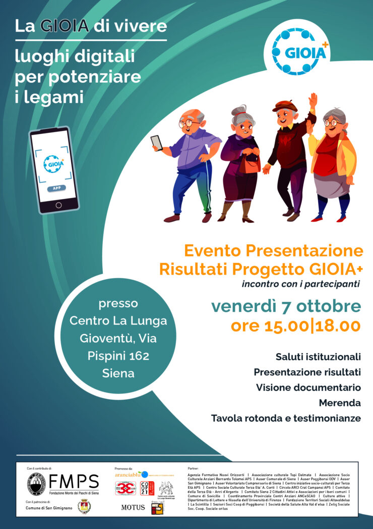 SIENA. La presentazione dei risultati del progetto “GIOIA + La Gioia di vivere, luoghi digitali per potenziare legami” si terrà a Siena venerdì 7 ottobre dalle 15.00 alle ore 18.00 presso la sede de La Lunga Gioventù (Via dei Pispini 162).