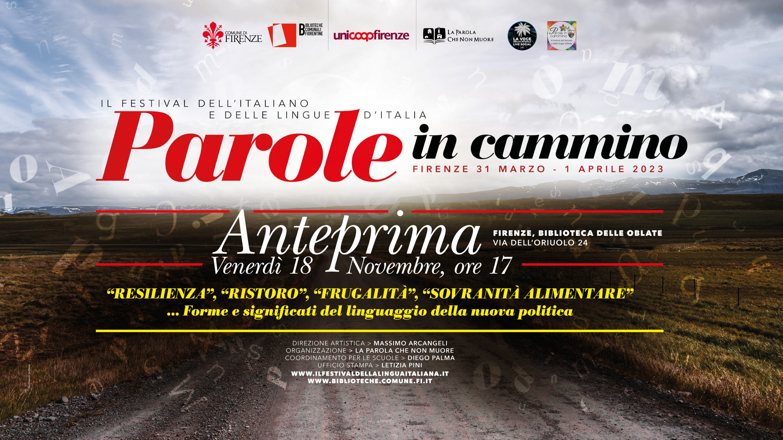 FIRENZE. Dopo l’edizione senese 2022 torna a Firenze “Parole in cammino. Festival dell’italiano e delle lingue d’Italia” (30, 31 marzo-1 aprile 2023), che inizia il suo percorso in città venerdì 18 novembre alle ore 17,00 con l’Anteprima presso la Biblioteca delle Oblate che inaugurerà la seconda edizione fiorentina.