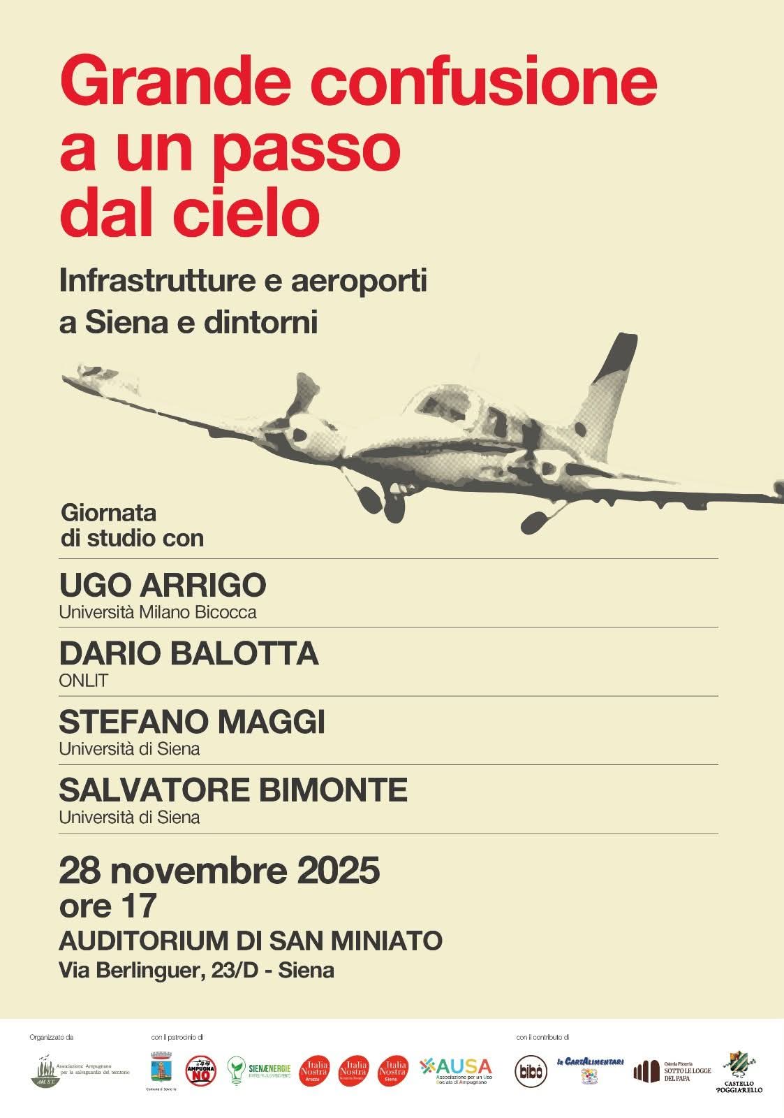La prossima settimana, venerdì 28 novembre, a partire dalle 17:00, a Siena nei locali dell’Auditorium di San Miniato in via Berlinguer 23/B, si terrà l’iniziativa “Grande confusione ad un passo dal cielo: infrastrutture e aeroporti a Siena e dintorni”, sostenuta dell’Associazione Ampugnano per la salvaguardia del territorio, dal Comitato AmpugnaNO e dall’Associazione AUSA.