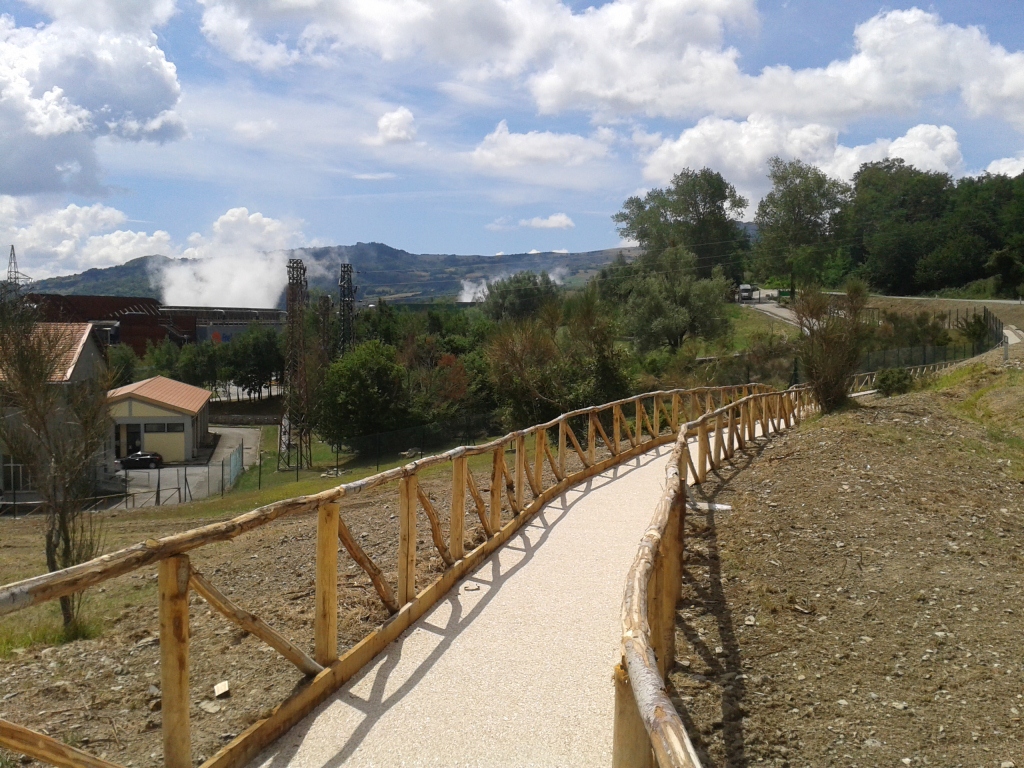 Il percorso si sviluppa prevalentemente all’esterno delle Centrali di Bagnore 4, Bagnore 3 e Bagnore 2, quest’ultima non più in funzione, per una lunghezza complessiva di circa 700 metri, con tre aree attrezzate per la sosta dei visitatori. La parte interna alla recinzione della centrale di Bagnore 4, collegata a quella esterna mediante un ingresso in sottopasso, conduce ad una particolare struttura metallica sopraelevata rispetto al piazzale dell’impianto, denominata “Passerella Belvedere” della lunghezza di 70 metri che domina la vallata sottostante. Sempre dal sottopasso, percorrendo un camminamento di circa 100 metri, si può arrivare ad un’altra area situata più in basso e anch’essa attrezzata per la sosta. Tutti i punti di sosta sono dotati di pannelli informativi che descrivono con testi e immagini il fenomeno geotermico, il funzionamento dell’impianto, le sue caratteristiche, i dettagli sugli abbattitori e il suo inserimento nel contesto paesaggistico.