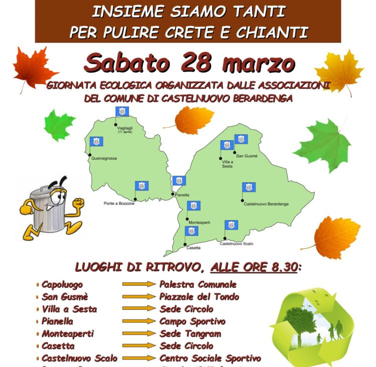 CASTELNUOVO BERARDENGA. Una mattinata dedicata all’ambiente, alla partecipazione e al senso di comunità. Sabato 28 marzo, a partire dalle ore 8.30, il Comune di Castelnuovo Berardenga promuove la Giornata Ecologica Insieme siamo tanti per pulire Crete e Chianti, iniziativa organizzata dalle associazioni del territorio con il coordinamento della Consulta Comunale dell’Associazionismo e del Volontariato.