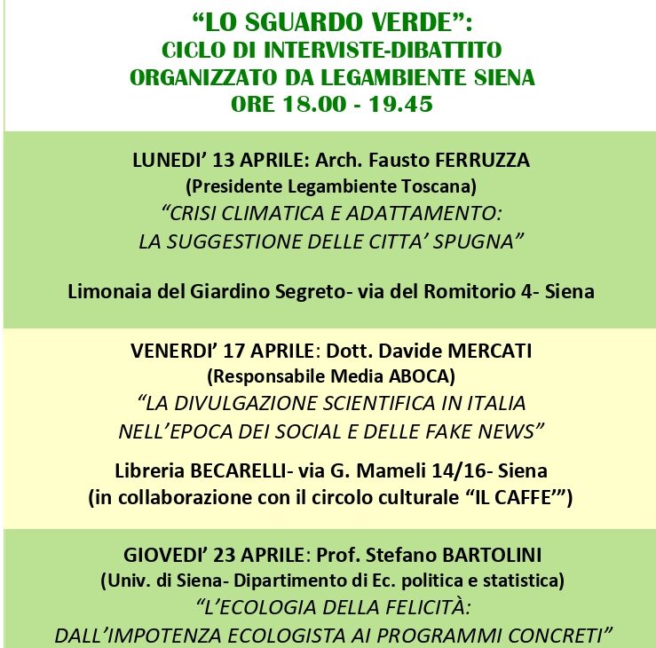SIENA. Tre interviste/dibattito in 11 giorni: questo l’ambizioso ciclo di incontri che Legambiente Siena organizza tra il 13 e il 23 aprile prossimi su vari temi di grande rilievo. Si comincia lunedì 13 presso la Limonaia di via del Romitorio 4, con l’intervento del presidente regionale dell’associazione, arch. Fausto Ferruzza, incentrato su come le città possono rendersi più sostenibili oggi rispetto agli impatti nefasti del cambiamento climatico. Si prosegue poi venerdì 17 aprile presso la libreria Becarelli, in via Mameli 14, dove parlerà il dr. Davide Mercati, responsabile Media dell’impresa toscana Aboca, su come si può gestire la comunicazione e la divulgazione scientifica in un contesto sempre più condizionato dai social media e influenzato da fake news. Concluderà il ciclo di eventi il giorno 23, di nuovo alla Limonaia, il prof. Stefano Bartolini, docente presso il dipartimento di economia politica e statistica, con un intervento significativamente intitolato: “L’ecologia della Felicità”. Tutti gli eventi si terranno tra le 18 e le 19.45, ad ingresso libero.