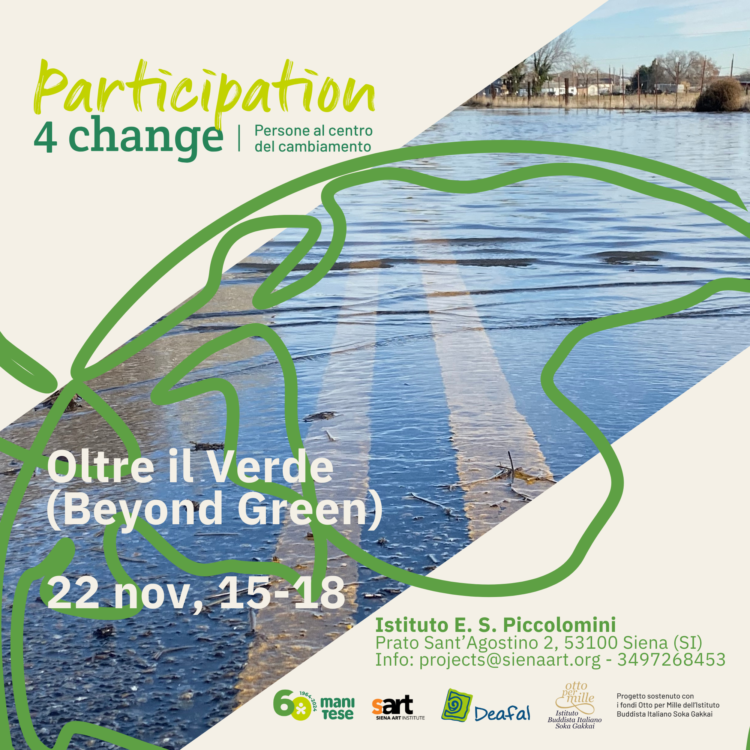 Appuntamento dunque con Oltre il Verde – Beyond Green per esplorare il tema della lotta al cambiamento climatico! Il progetto Participation4Change è realizzato da Mani Tese, Deafal, Siena Art Institute, ed è sostenuto con i fondi Otto per Mille dell’Istituto Buddista Italiano Soka Gakkai.