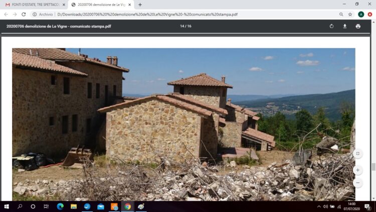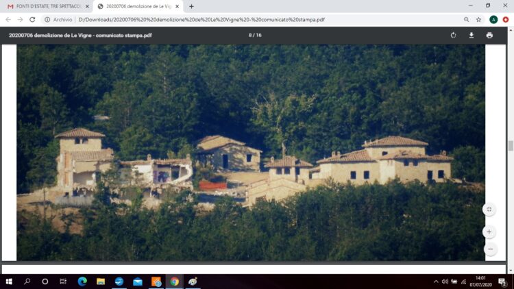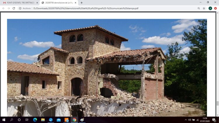 “A distanza di molti anni, forse troppi, sono finalmente iniziati i lavori di demolizione del Podere Le Vigne a Casole d’Elsa nel silenzio ingiustificato dei media, che il Covid-19 può spiegare solo in parte. Era il 2007 quando la Procura di Siena iniziò ad indagare sui molti abusi che si stavano consumando nel Comune di Casole d’Elsa dando origine alla più grande ondata di sequestri immobiliari di tutti i tempi in Toscana: Pietralata di Berignone, San Severo, la Fornace di Poggio Marino, vari insediamenti residenziali in Cavallano, oltre al complesso de Le Vigne. Fu proprio la sezione di Italia Nostra di Siena ad accendere i riflettori sui molti abusi che si stavano realizzando grazie alla vigilanza attiva di molti cittadini residenti a Casole d’Elsa. Le indagini furono intraprese dalla Procura della Repubblica di Siena sotto la direzione del Sost.Proc. Mario Formisano e si conclusero con il rinvio a giudizio di sei imputati