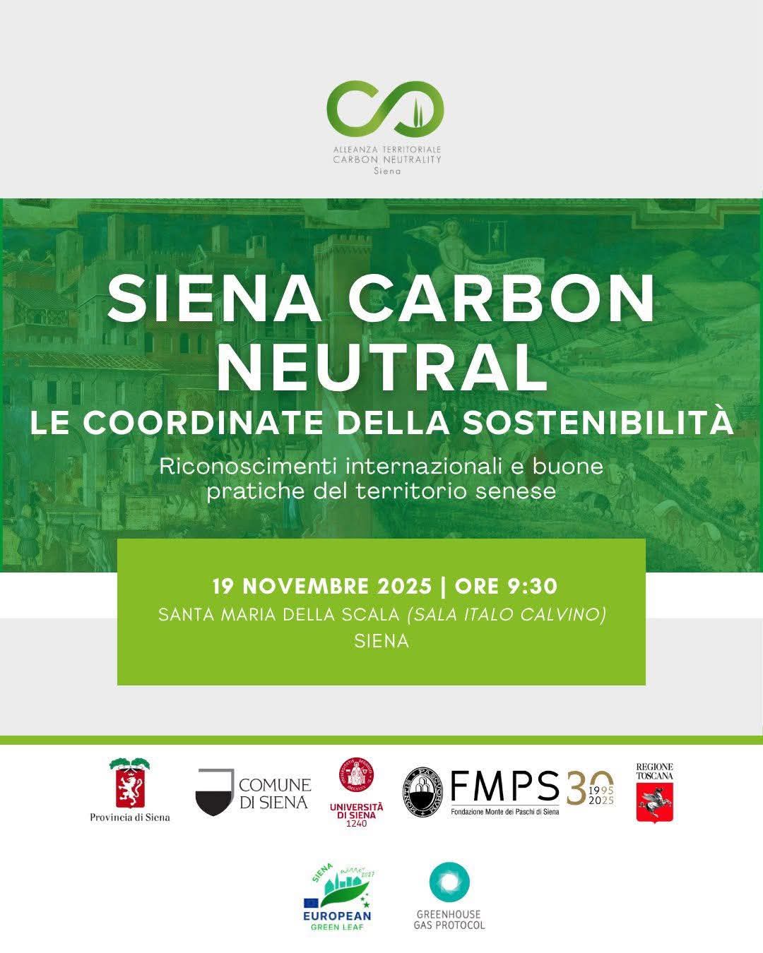 Mercoledì 19 novembre, al Santa Maria della Scala, l’appuntamento è con “Siena Carbon Neutral, le coordinate della sostenibilità”. Saranno illustrati i dati aggiornati dell’inventario certificato, le metodologie adottate e le esperienze territoriali che hanno contribuito al raggiungimento di questo risultato, in un momento che conferma il territorio senese come riferimento nazionale e internazionale per le politiche di sostenibilità.