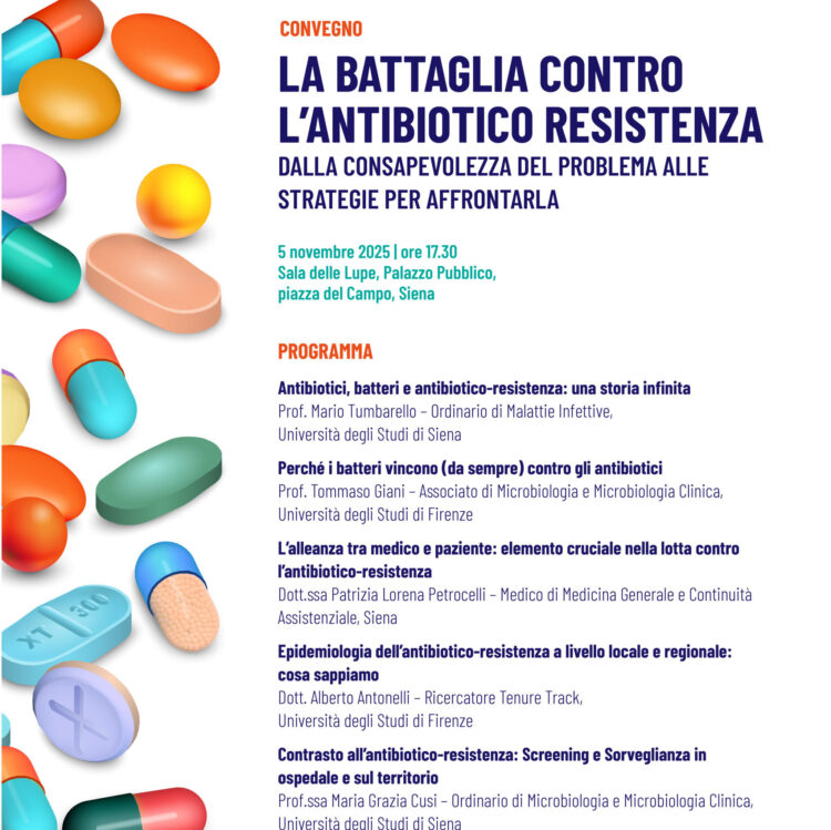 “Il Comune di Siena – dichiara l’assessore alla sanità Giuseppe Giordano – intende contribuire a diffondere una maggiore consapevolezza sull’uso corretto degli antibiotici e sull’importanza della prevenzione delle infezioni. Parlare di antibioticoresistenza significa parlare di salute pubblica, di responsabilità condivisa tra cittadini e operatori sanitari, ma anche di cultura scientifica e civica. Con questo convegno vogliamo offrire un’occasione di approfondimento accessibile a tutti, per comprendere meglio le sfide che il nostro sistema sanitario deve affrontare e le strategie per contenerle”.