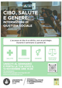 Alessandra Viviani SIENA. Il tema dell’accesso al cibo quale chiave per comprendere e riconoscere nuove discriminazioni che agiscono a livello economico, culturale, sociale e sanitario saranno discussi nel seminario “Cibo, salute e genere: intersezioni di giustizia sociale. Tutela della vita tra gender-care, salute pubblica e giustizia multispecie”, in programma il 13 novembre 2025, alle ore 14:30, nell’Aula 4 del Dipartimento di Scienze Politiche e Internazionali (DISPI) dell’Università di Siena (via Mattioli 10, Siena).