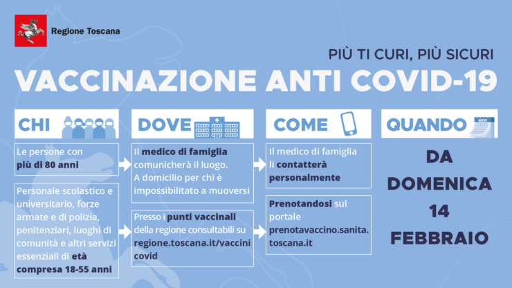 Per le persone tra i 18 e i 55 anni la prenotazione sarà disponibile sul portale regionale dove è possibile scegliere data, ora e luogo per la vaccinazione in uno dei 49 punti vaccinali, attivati in tutta la Toscana a partire dal 14 febbraio 2021, come da elenco pubblicato su https://www.regione.toscana.it/-/dove-vaccinarsi. Successivamente ne saranno attivati altri 7 per un totale complessivo di 56 punti vaccinali.