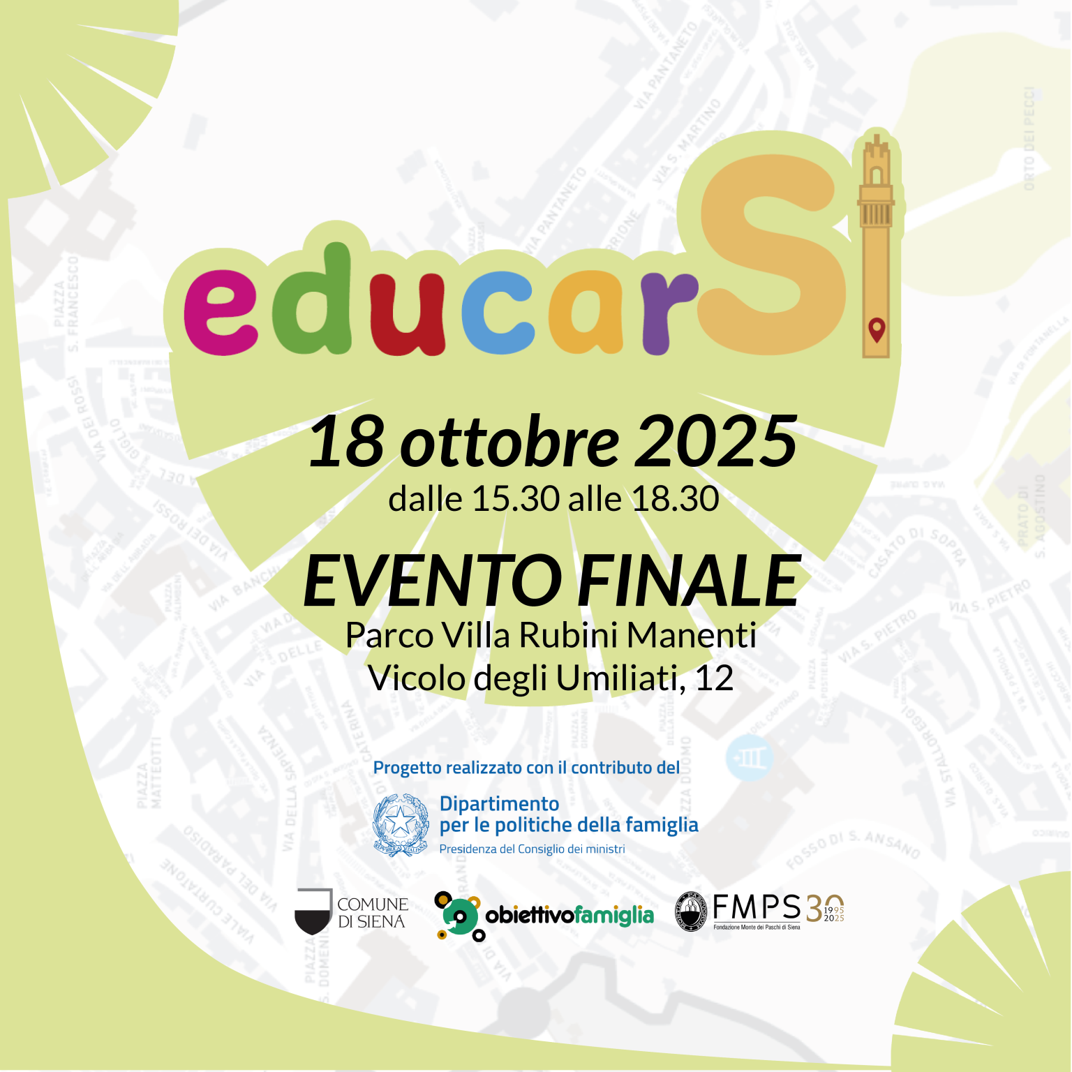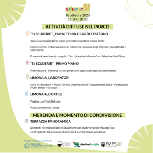 EduCarSi” è un progetto del Comune di Siena promosso e finanziato dal Dipartimento per le politiche della famiglia della Presidenza del Consiglio dei Ministri e volto alla realizzazione di attività per il contrasto della povertà educativa ed il sostegno delle opportunità culturali di bambini/e e ragazzi/e minorenni.