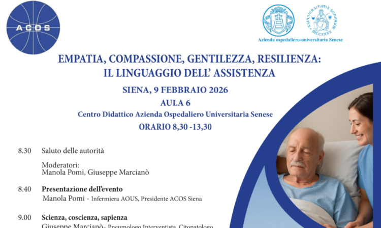SIENA. L’Associazione Cattolica Operatori Sanitari di Siena, in collaborazione con l’Azienda ospedaliero-universitaria Senese, organizza, in occasione della Giornata mondiale del Malato, un convegno dal titolo “Empatia, compassione, gentilezza, resilienza: il linguaggio dell’assistenza”. «Partendo dal tema scelto da Papa Leone XIV ” la compassione del samaritano”, – afferma Manola Pomi, presidente di ACOS Siena – il corso vuole offrire spunti di riflessione per e con i professionisti della cura. Soffermandosi sull’importanza che hanno i gesti di cura, che non sono solo “azioni, tecnicismi per i quali siamo “addestrati”, il convegno vuole evidenziare come la cura completa abbia bisogno di gesti concreti di vicinanza e farsi carico dell’altro: il paziente, la famiglia ma anche il collega». Il convegno si terrà lunedì 9 febbraio a partire dalle ore 8.30 nell’aula 6 del centro didattico dell’Aou Senese. Dopo la presentazione dell’evento a cura della presidente Pomi, si terranno un intervento del dottor Giuseppe Marcianò dal titolo “Scienza, coscienza, sapienza, del professor Andrea Pozza con “La resilienza, la cura i curanti…”, e del dottor Maurilio Pallassini con “La gentilezza”. Spazio poi al monologo di Margherita Fusi dal titolo “Lo spirito della cura”, e agli interventi di Aurelio Filippini dal titolo “Il linguaggio della cura: empatia, compassione, gentilezza, resilienza” e di Lucia Teresa Benetti, scrittrice e paziente, formatrice e paziente oncologica, che chiuderà il convegno con le sue riflessioni intitolate “Le stanze della cura”. «Il corso – prosegue Manola Pomi, presidente ACOS Siena – vuole offrire approfondimenti sul linguaggio dell’assistenza che comprende i termini come: empatia, la capacità di ascoltare e comprendere l’altro nella sua unicità; compassione, impegno ad alleviare la sofferenza con presenza e rispetto; gentilezza, gesto quotidiano che umanizza la cura; resilienza, forza silenziosa che sostiene chi assiste e chi è assistito nei momenti di fragilità».