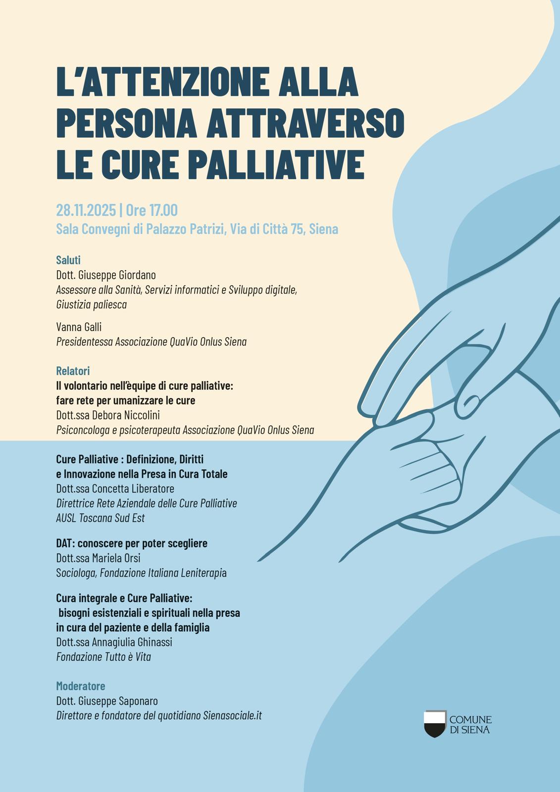 SIENA. Accompagnare le persone e le loro famiglie nel momento più fragile dell’esistenza è una responsabilità che coinvolge l’intera comunità. Con questo spirito, in occasione della Giornata nazionale delle cure palliative, il Comune di Siena promuove il convegno “L’attenzione alla persona attraverso le cure palliative”, in programma venerdì 28 novembre alle ore 17.30 in Sala Patrizi (via di Città, 75). L’appuntamento nasce dalla sinergia tra amministrazione comunale, terzo settore e professionisti della sanità, e rappresenta un invito a riflettere su un tema che unisce competenza, umanità e diritti.