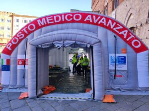 SIENA. Il nuovo Posto Medico Avanzato (PMA) per le maxiemergenze è realtà. È stato inaugurata oggi in Piazza del Campo a Siena la nuova tenda pneumatica per il primo trattamento avanzato dei feriti in dotazione della Centrale operativa 118 di Siena-Grosseto.