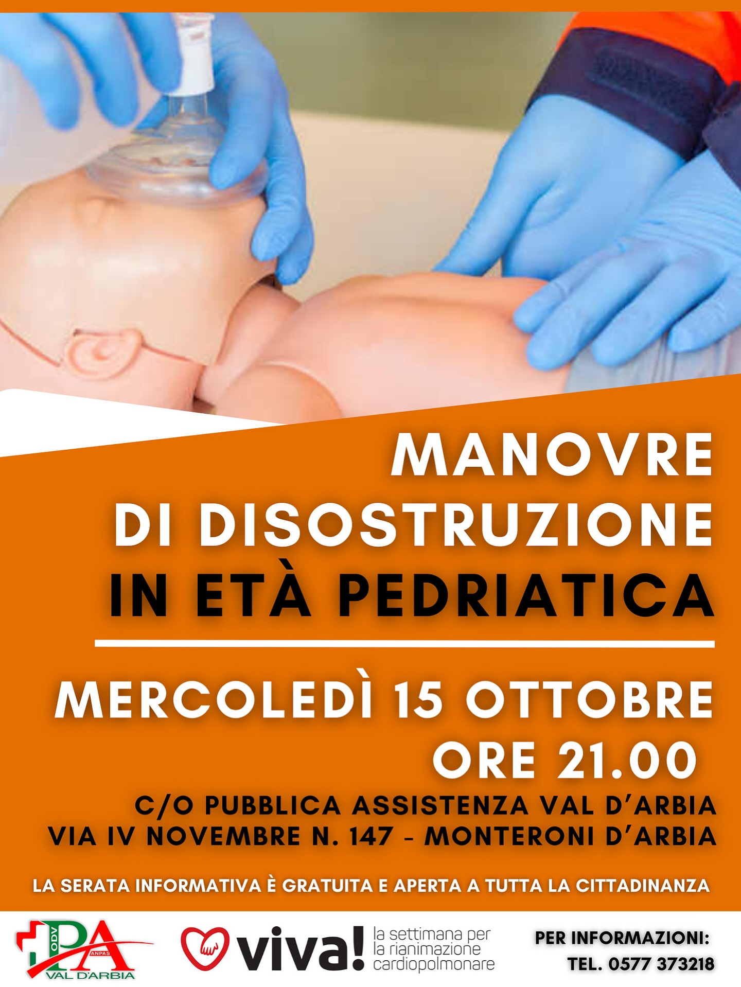 MONTERONI D’ARBIA. Nell’ambito della Settimana Viva, promossa da IRC – Italian Resuscitation Council con la collaborazione di ANPAS, Croce Rossa Italiana e Misericordie d’Italia per diffondere la cultura del soccorso, la Pubblica Assistenza Val d’Arbia organizza una serata informativa dedicata alle manovre di disostruzione in età pediatrica.