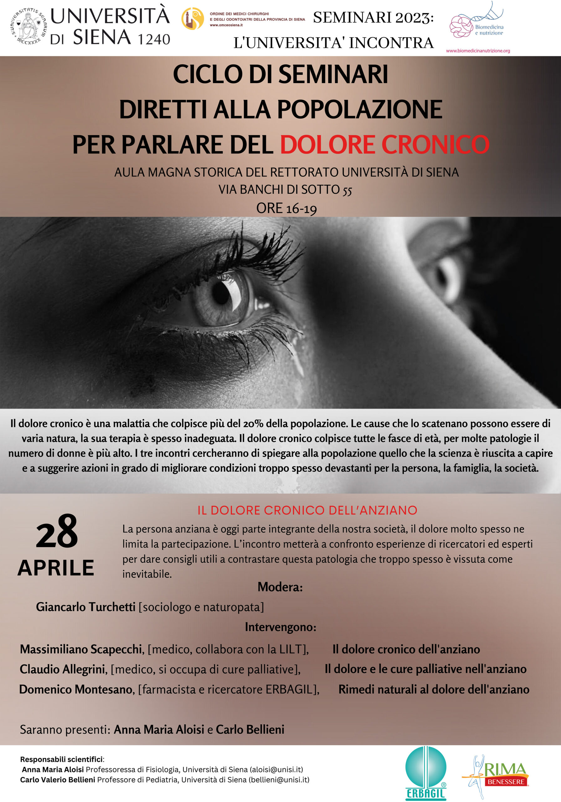 Il secondo appuntamento si terrà venerdì 28 aprile e avrà come tema “Il dolore cronico dell’anziano”. La persona anziana è oggi parte integrante della nostra società, il dolore molto spesso ne limita la partecipazione. L’incontro metterà a confronto esperienze di ricercatori ed esperti per dare consigli utili a contrastare questa patologia che troppo spesso è vissuta come inevitabile.
