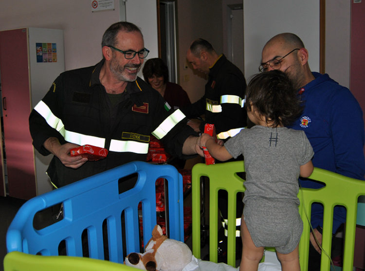 SIENA. Ultima visita della Befana per i pazienti del Dipartimento Materno Infantile dell’Azienda ospedaliero-universitaria Senese. Regali, magliette e gadgets sono quelli portati dai Vigili del Fuoco del Comando di Siena, in visita al policlinico Santa Maria alle Scotte con il loro carico di auguri e allegria per i piccoli degenti e le loro famiglie. Ad accogliere i Vigili del Fuoco, guidati dal comandante provinciale Luca Nassi, il professor Mario Messina, direttore del Dipartimento Materno Infantile, il professor Salvatore Grosso, direttore della UOC Pediatria, e la coordinatrice infermieristica Giuliana Masiero. I Vigili del Fuoco senesi si sono recati anche nell’UOC Neuropsichiatria infantile diretta dal dottor Joussef Hayek.