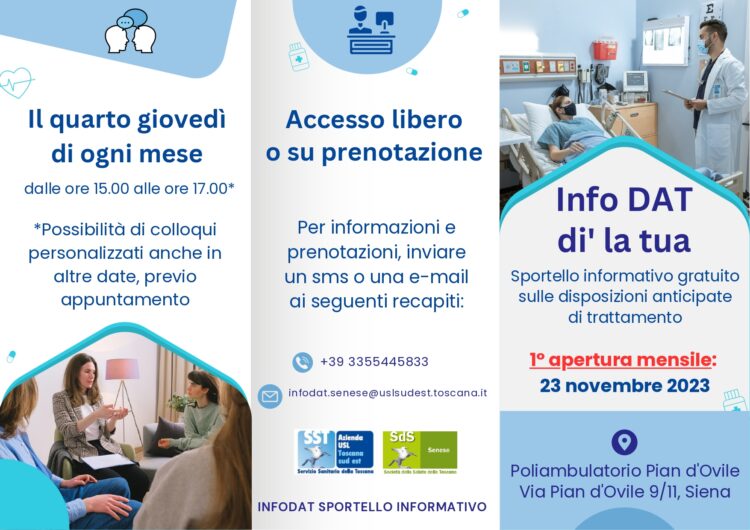 SIENA. Arrivato ai due anni di apertura, lo sportello informativo sulle Disposizioni Anticipate di Trattamento (DAT) aperto presso il Poliambulatorio di Pian d’Ovile a Siena continua con gli open day mensili. Fissati ogni quarto giovedì del mese (dalle 15 alle 17) ad accesso libero, sono momenti di approfondimento e confronto con la cittadinanza sul testamento biologico, cioè sul diritto riconosciuto dalla Legge 219/2017 di esprimere le proprie volontà in merito ai trattamenti sanitari che si intende ricevere o rifiutare nel caso di sopraggiunta incapacità decisionale.