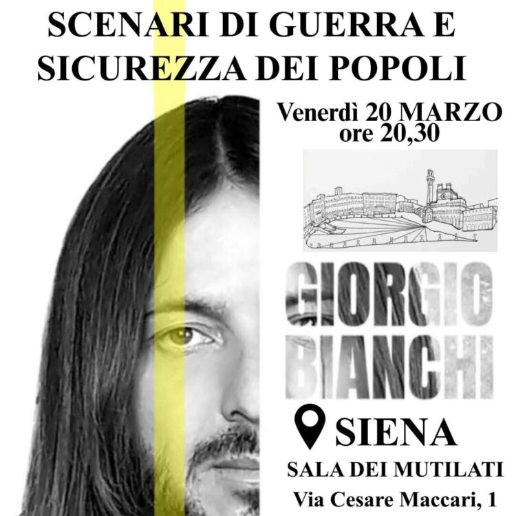 SIENA. Venerdì 20 marzo alle ore 20.30 presso la Sala dei Mutilati in Viale Cesare Maccari n. 1 di Siena si terrà l’evento dal Titolo “Scenari di guerra e sicurezza dei popoli”. L’iniziativa, organizzata dai gruppi La Senesina, Il Comitato il Dubbio e l’ Associazione MMT Italia vedrà come protagonista il fotoreporter Giorgio Bianchi, documentarista e videomaker italiano, noto per i suoi reportage in zone di conflitto, in particolare in Ucraina (Donbass). Attivo come reporter indipendente su YouTube e social media ha lavorato in Siria, Burkina Faso, Vietnam, Myanmar, Nepal, India ed Europa. Freelance con focus politico e antropologico grazie alle sue esperienze sul campo analizzerà e fornirà una lettura geopolitica dell’attuale situazione internazionale attraverso un excursus generale al fine di comprendere la complessità dei presupposti politici internazionali e le correlazioni con la politica, finanza, sicurezza sociale e sanitaria.