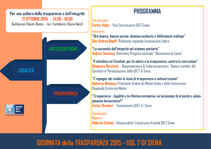 SIENA. Per la seconda giornata della Trasparenza organizzata dalla Azienda Usl 7 il 21 Ottobre alle ore 15,30 presso l’Auditorium Chianti Banca – Loc. Fontebecci, il tema sarà “Per una cultura della trasparenza e integrità”.