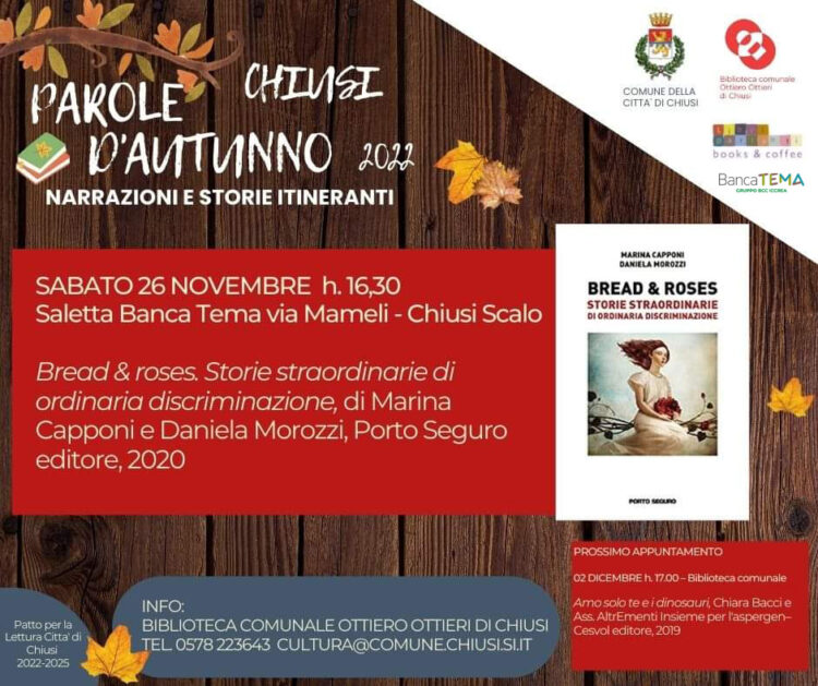 Sabato 26 la tematica verrà analizzata e declinata nella sua fenomenologia all’interno del mondo del lavoro con la presentazione del libro ‘Bread & roses. Storie straordinarie di ordinaria discriminazione’. Alla presentazione che avverrà presso la saletta di Banca Tema alle ore 16.30 a Chiusi Scalo, e che fa parte del ciclo “PAROLE D’AUTUNNO: narrazioni e storie itineranti 2022” le autrici Marina Capponi e Daniela Morozzi parleranno della loro opera.