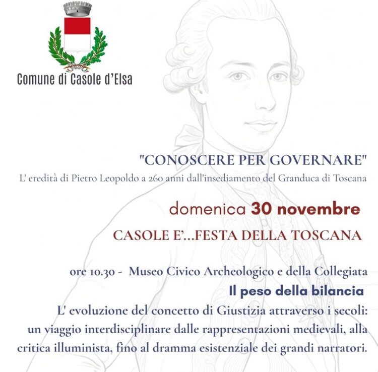 CASOLE D’ELSA. In occasione dell’edizione 2025 della Festa della Toscana, che celebra l’abolizione della pena capitale voluta dal Granduca Pietro Leopoldo nel 1786, il Museo Civico, Archeologico e della Collegiata di Casole d’Elsa propone un incontro fra arte, storia e letteratura, intitolato Il peso della bilancia.