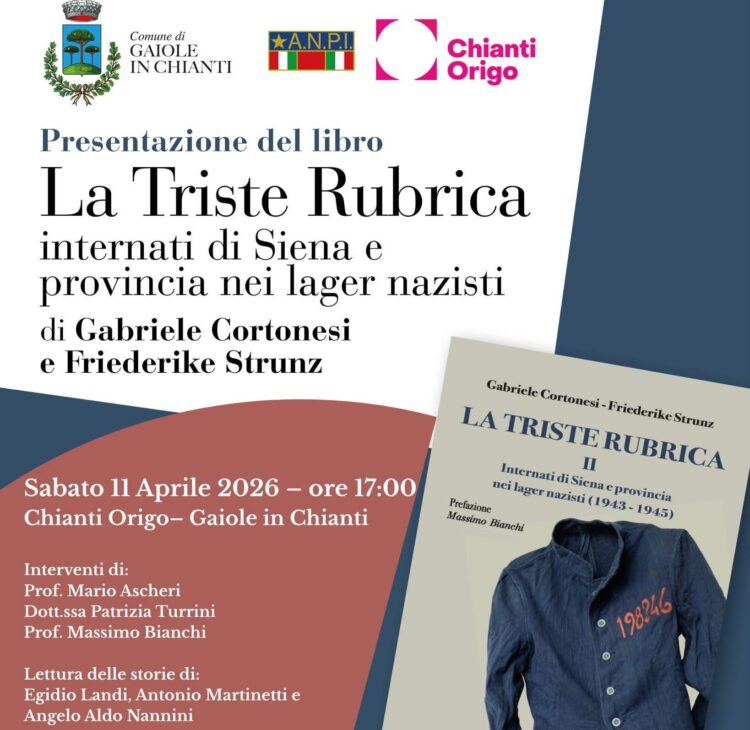 GAIOLE IN CHIANTI. Sabato 11 aprile, alle ore 17, a Gaiole in Chianti, presso Chianti Origo si terrà la presentazione del libro “La triste rubrica, internati di Siena e provincia nei lager nazisti” di Gabriele Cortonesi e Friederike Strunz.