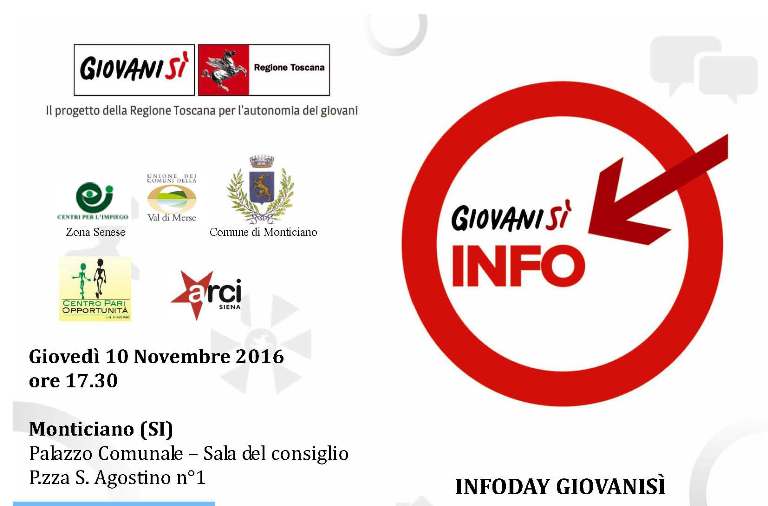 L’Infoday, a cura del Referente territoriale Giovanisì per la provincia di Siena, in collaborazione con l’Unione dei Comuni della Val di Merse, il Comune di Monticiano, il Centro per l’Impiego Zona Senese, il Centro Pari Opportunità dell’Unione dei Comuni e con l’ARCI Provinciale di Siena, inizierà alle ore 17.30, presso la sala del consiglio del Palazzo Comunale, in piazza S. Agostino 1. Durante l’iniziativa il Referente territoriale darà informazioni anche su Garanzia Giovani in Toscana.