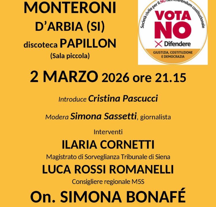 MONTERONI D’ARBIA. Il dibattito sul Referendum costituzionale previsto per il 22 e 23 marzo entra nel vivo. Il Comitato per il NO di Monteroni d’Arbia organizza per lunedì 2 marzo alle ore 21 presso la sala piccola della discoteca Papillon un incontro di approfondimento con ospiti illustri, moderati dalla giornalista Simona Sassetti si alterneranno negli interventi Ilaria Cornetti, Magistrata di Sorveglianza del Tribunale di Siena, Luca Rossi Romanelli, consigliere regionale del Movimento 5 Stelle e l’On. Simona Bonafè, Deputata del Partito Democratico.