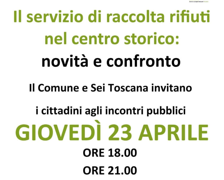 POGGIBONSI. Si svolgerà domani, 23 aprile, un doppio incontro dedicato alla raccolta rifiuti in centro storico. Nell’ambito della nuova fase avviata con l’obiettivo di affinare e migliorare il sistema, il Comune e Sei Toscana promuovono un ciclo di incontri con la città per fare il punto sul percorso avviato con la riorganizzazione, spiegare le novità che stanno per essere attivate e proseguire le azioni di ascolto e di confronto.
