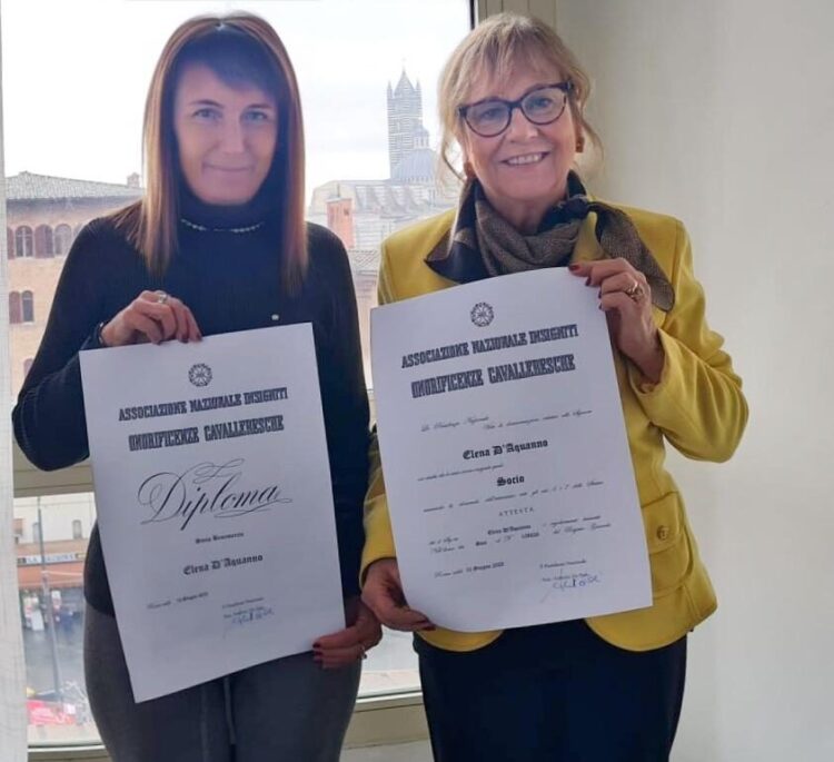 SIENA. L’Associazione Nazionale Insigniti Onorificenze Cavalleresche che riunisce insigniti di onorificenze cavalleresche e opera per la tutela e la promozione di valori civici, morali e istituzionali, attraverso attività culturali, sociali e iniziative di solidarietà su tutto il territorio nazionale con una struttura organizzata in delegazioni territoriali, ha conferito a Elena D’Aquanno l’onorificenza di “Socia Benemerito”.