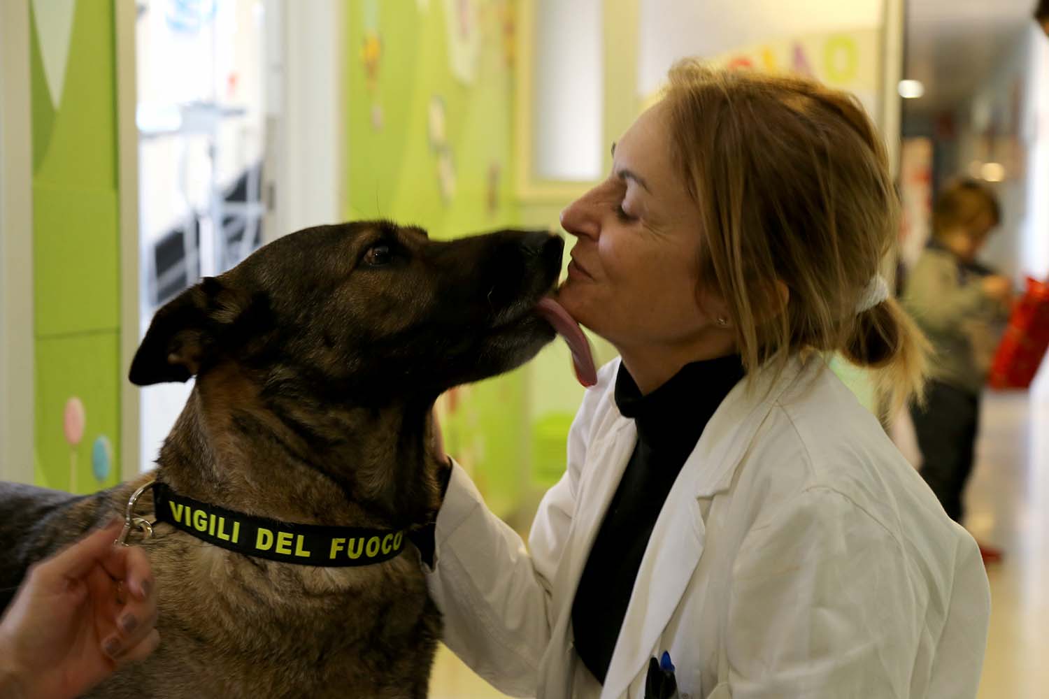 SIENA. La Befana dei Vigili del Fuoco ha portato allegria e felicità ai piccoli pazienti del Dipartimento Materno Infantile dell’Azienda Ospedaliera Universitaria Senese. Giochi di vari tipi, il calendario e le magliette di Vigili del Fuoco sono stati consegnati ai pazienti e al personale del Dipartimento, rappresentato dai professori Salvatore Grosso e Mario Messina, direttori della Pediatria e della Chirurgia Pediatrica delle Scotte, e da Giuliana Masiero, coordinatrice infermieristica. La star della giornata è stata Aika, esemplare di pastore tedesco che fa parte del Nucleo Cinofilo dei Vigili del Fuoco: tra le sue missioni anche quella recente ad Amatrice.