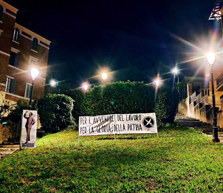 {"remix_data":[],"remix_entry_point":"challenges","source_tags":["local"],"origin":"unknown","total_draw_time":0,"total_draw_actions":0,"layers_used":0,"brushes_used":0,"photos_added":0,"total_editor_actions":{},"tools_used":{"effects":1},"is_sticker":false,"edited_since_last_sticker_save":true,"containsFTESticker":false} SIENA. “Per l’avvenire del lavoro, per la gloria della Patria”. Con questa frase scritta in uno striscione e con una gigantografia apposta al fianco dello striscione, in via Corridoni a Siena, i militanti dell’Associazione Culturale Il Selvaggio hanno voluto commemorare i 110 anni dalla morte del sindacalista.