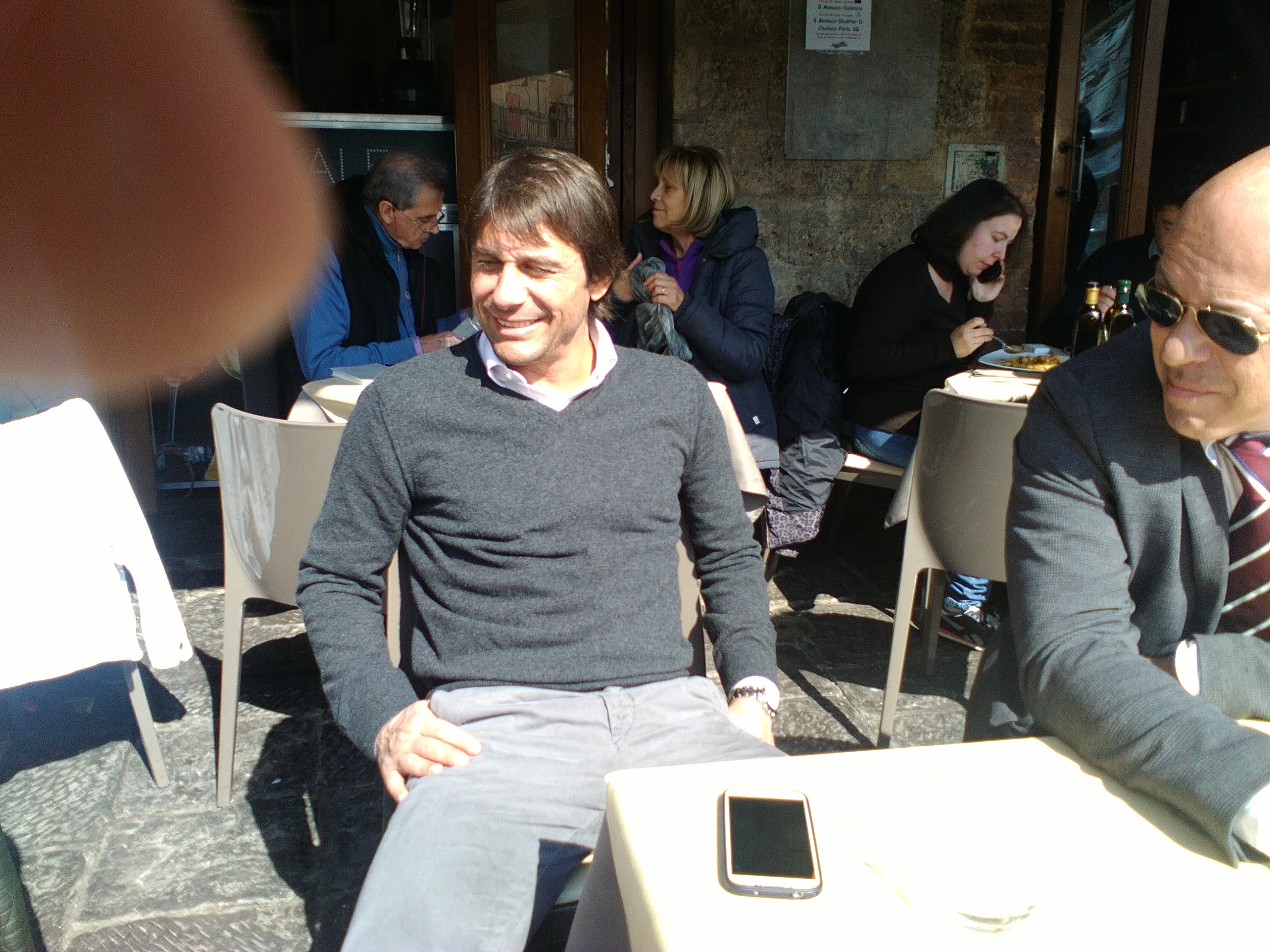 SIENA. In attesa di ricevere dai Fedelissimi il premio Robur (ore 17 nella Sala delle Lupe del Comune di Siena), il ct Antonio Conte, ex allenatore dell’AC Siena, si gode il sole di Piazza del Campo