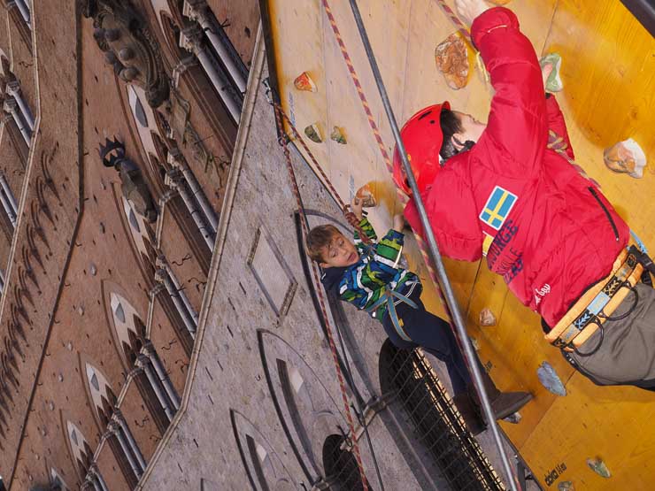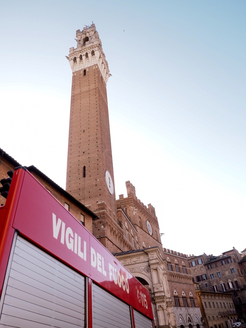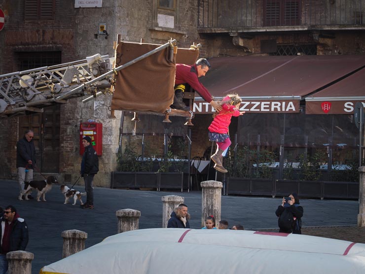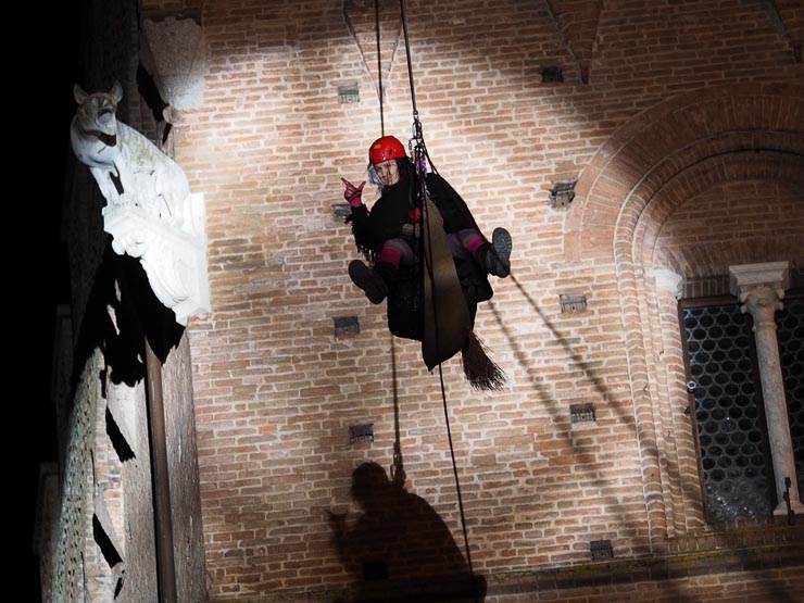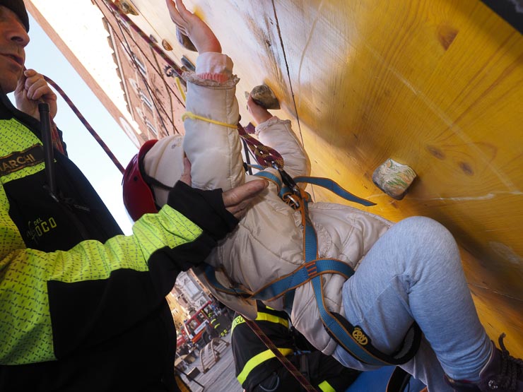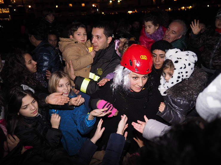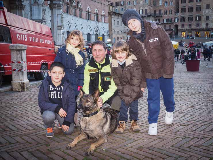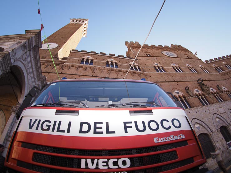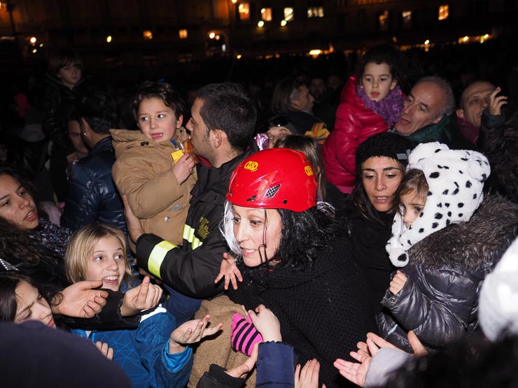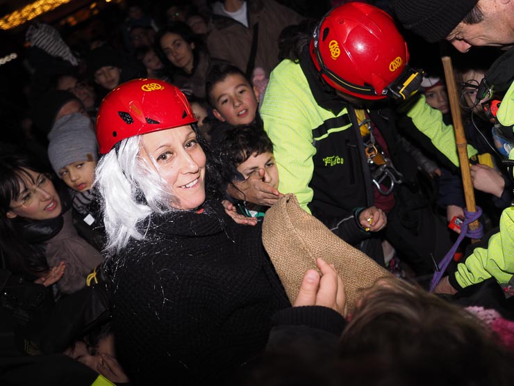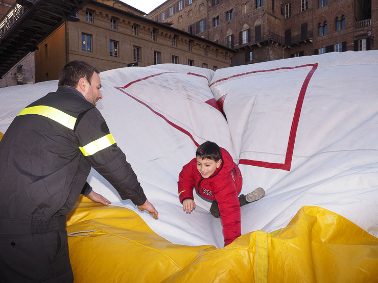 SIENA. Folla di bambini e genitori per l’arrivo della Befana dei Vigili del Fuoco in piazza del Campo. La vecchina è arrivata come al solito dai merli del Palazzo Comunale, distribuendo caramelle dall’alto.