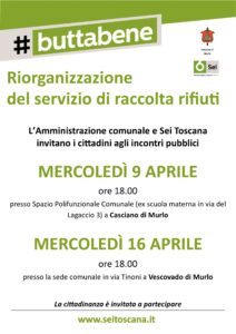 Per illustrare a tutti i cittadini i nuovi servizi e gli obiettivi della riorganizzazione, l’Amministrazione comunale e Sei Toscana hanno organizzato due incontri pubblici che si terranno mercoledì 9 aprile, alle 18, a Casciano di Murlo nello Spazio Polifunzionale Comunale (presso l’ex scuola materna in via del Lagaccio 3) e mercoledì 16 aprile alle 18 presso la sede comunale di via Tinoni a Vescovado di Murlo. Nel corso degli incontri sarà distribuita a tutti i partecipanti la nuova guida alla raccolta differenziata #BUTTABENE.