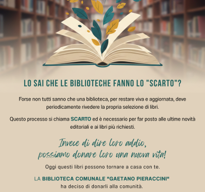 Il progetto consiste nel mettere a disposizione della comunità libri usati o deteriorati, oggetto comunque di ‘scarto’ da parte della biblioteca comunale in seguito alle procedure in vigore, per rimetterli in circolo e promuovere così la lettura e la cultura. Un’attività già sperimentata in altre circostanze e che torna adesso con un vero e proprio progetto che sarà ospitato all’interno della prossima edizione di Sbaraccando.
