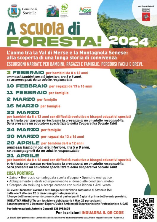 Le attività sono tutte gratuite e sono promosse dal Comune di Sovicille all’interno del finanziamento regionale DOA 2023 Azione A2, nell’ambito della convenzione sottoscritta dalla Regione Toscana con i Comuni della Val di Merse per la gestione aggregata delle riserve naturali regionali Alto e Basso Merse in attuazione della Legge Regionale 30/2015 “Norme per la conservazione e la valorizzazione del patrimonio naturalistico ambientale regionale”.