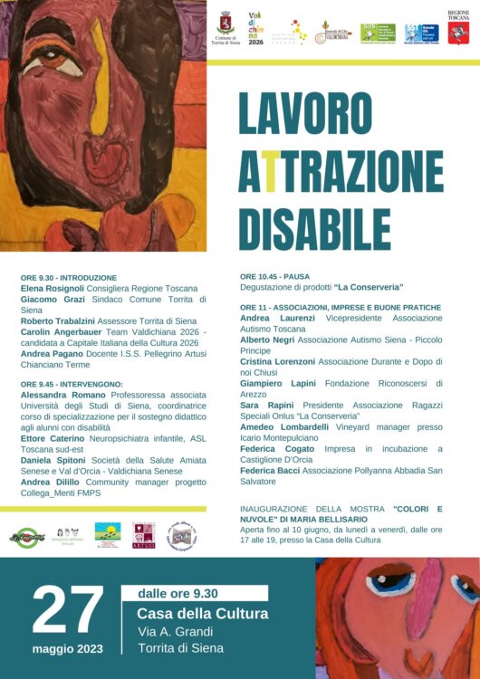 “Lavoro aTtrazione disabile” vuole essere un momento di incontro e riflessione su un argomento che riguarda direttamente la vita di molte persone – spiega l’assessore Roberto Trabalzini – Grazie ai tanti relatori che hanno accettato l’invito a Torrita di Siena sabato 27 maggio, di sicuro nascerà un confronto interessante e magari utile alla nascita di nuovi progetti”.