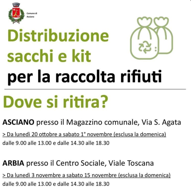 ASCIANO. Prosegue la campagna di consegna dei kit per la raccolta differenziata nel Comune di Asciano, in vista della riorganizzazione dei servizi di raccolta rifiuti che entrerà ufficialmente in vigore lunedì 17 novembre, con l’obiettivo di incrementare e massimizzare la percentuale di raccolta differenziata e di riciclo dei materiali, oltre a favorire il miglioramento del decoro urbano.