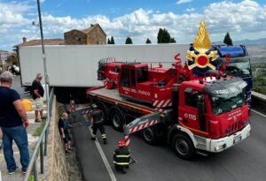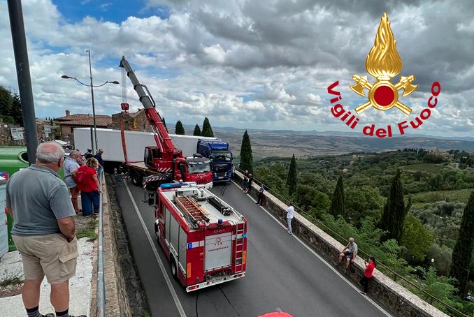 MONTALCINO. I Vigili del fuoco del comandi di Siena, distaccamento di Montalcino, sono intervenuti alle ore 10:55 sulla SP 14 Via Traversa di Monti nel comune di Montalcino, per un “ingombro stradale”: un mezzo pesante è rimasto bloccato nella curva di un tornante.