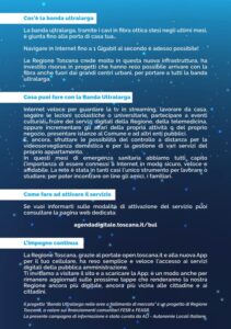 È la campagna comunicativa “La Toscana va a mille” lanciata dalla Regione Toscana in collaborazione con Ali (Autonomie locali italiane) partita nelle settimane scorse per recapitare nelle vie interessate dall’intervento di Open Fiber e dell’attivazione del servizio nelle aree bianche, cioè più quelle nelle quali gli operatori privati non sono ancora intervenuti. Gli utenti di queste zone potranno quindi connettersi alla banda ultra larga e migliorare così in maniera notevolissima la loro connettività, finora spesso impossibile.