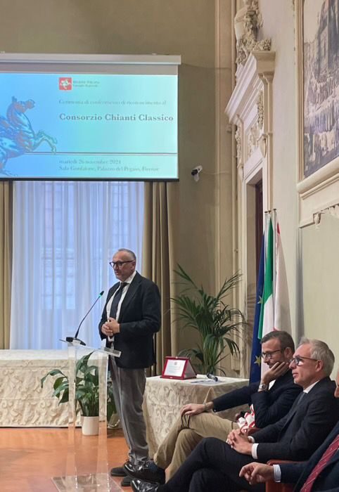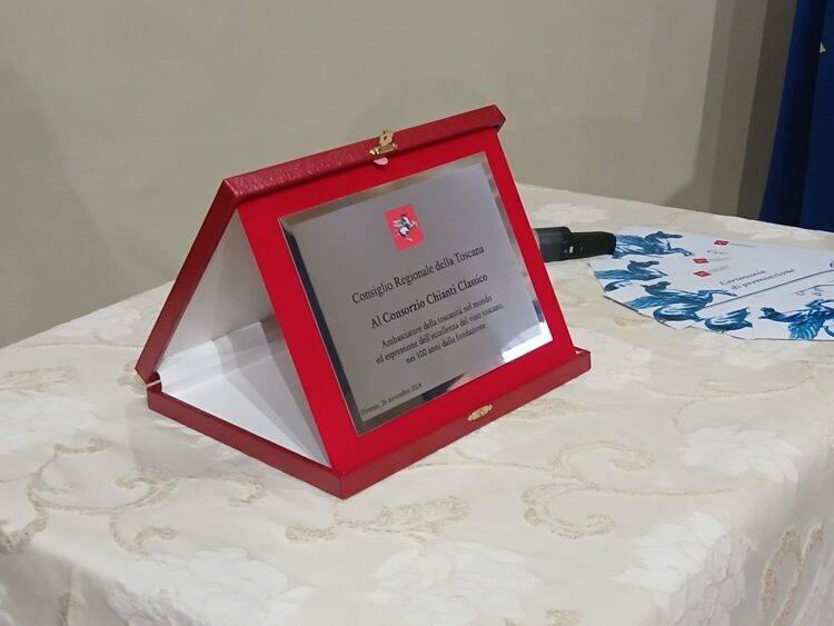 CASTELLINA IN CHIANTI. “Complimenti al Consorzio Chianti Classico per il riconoscimento ricevuto dal Consiglio regionale in occasione dei suoi 100 anni di attività. Questo testimonia il suo ruolo di ambasciatore della toscanità e del Chianti nel mondo e ribadisce quanto il Consorzio sia uno dei motori fondamentali al fianco delle istituzioni per tutelare e sviluppare un territorio che aspira a entrare nel Patrimonio dell’Umanità Unesco”. Con queste parole il sindaco di Castellina in Chianti, Giuseppe Stiaccini, commenta l’iniziativa a cui ha partecipato ieri, martedì 26 novembre, nella sala del Gonfalone di Palazzo del Pegaso a Firenze, dove il presidente del Consiglio regionale della Toscana, Antonio Mazzeo, ha consegnato al Consorzio Chianti Classico, rappresentato dal presidente, Giovanni Manetti, una targa con la motivazione: “Ambasciatore della toscanità nel mondo ed espressione dell’eccellenza del vino toscano, nei 100 anni della fondazione”.