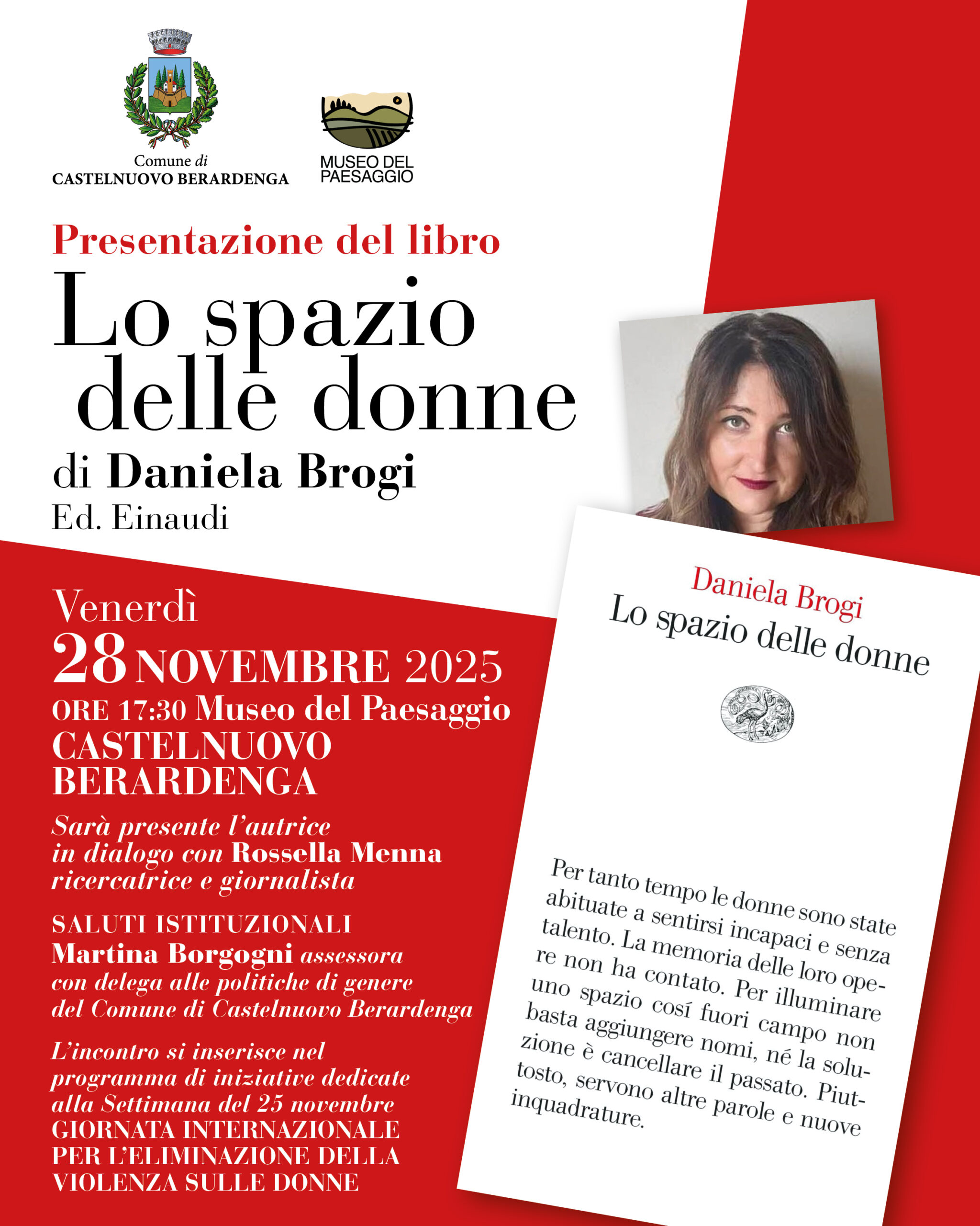 CASTELNUOVO BERARDENGA. In occasione della Giornata Internazionale per l’Eliminazione della Violenza contro le Donne, il Comune di Castelnuovo Berardenga propone un appuntamento di approfondimento culturale e civile: venerdì 28 novembre 2025 alle ore 17.30, al Museo del Paesaggio, si terrà la presentazione del libro Lo spazio delle donne (Einaudi) di Daniela Brogi, saggista e docente di Letteratura italiana contemporanea all’Università per Stranieri di Siena. L’autrice dialogherà con Rossella Menna, ricercatrice e giornalista. Aprirà l’incontro l’assessora alle politiche di genere del Comune di Castelnuovo Berardenga, Martina Borgogni, con i saluti istituzionali.