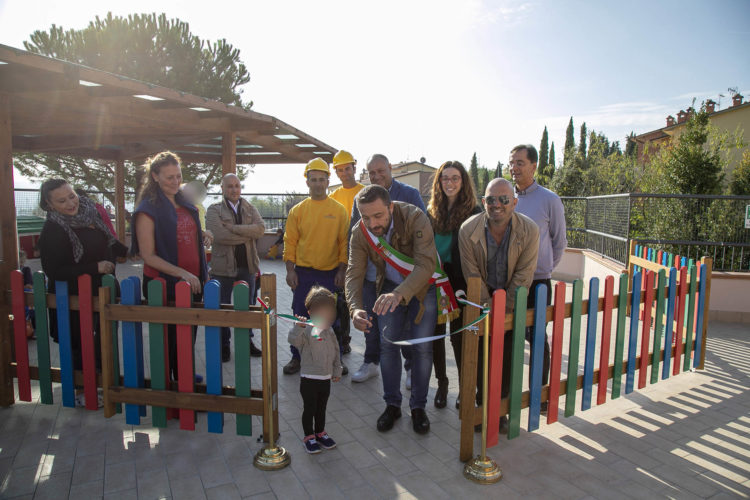CHIUSI. I piccoli del Nido Girasole a Chiusi Scalo hanno tagliato il nastro della nuova terrazza insieme al sindaco Juri Bettollini, all’assessore ai lavori pubblici Andrea Micheletti e all’assessore all’infanzia Sara Marchini. I lavori all’asilo nido, recentemente premiato per la qualità sia della struttura sia del programma didattico con un contributo della Regione Toscana e dell’Unione Europea (progetto POR FSE 2014-2020) pari a 16.572,42, hanno interessato in particolare l’area del terrazzo dove è stata sostituita tutta la vecchia pavimentazione con una completamente impermeabile. Oltre a questo gli interventi hanno migliorato tutta l’area esterna della struttura, in particolare è stato modificato il cancello di ingresso con la realizzazione di un pianerottolo sopraelevato e una rampa di accesso per disabili; è stata installata sul terrazzo una struttura in legno provvista di telo ombreggiante, che limiterà i raggi solari sull’area giochi esterna e sono state sostituite le attuali coperture in policarbonato danneggiate poste in sommità alle pensiline metalliche su tutti e tre i livelli della struttura scolastica.