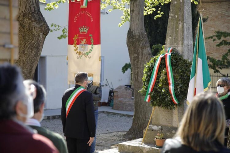 CHIUSI. La Città di Chiusi ha celebrato la Festa della Liberazione onorando i caduti ricordati nei vari monumenti dislocati nel territorio. Anche se in forma ristretta e senza cortei il sindaco, accompagnato dagli assessori della giunta comunale, dal gonfalone del Comune, dai rappresentanti della sezione A.N.P.I. Tiradritti di Chiusi e dalla tromba del Maestro della Filarmonica Città di Chiusi, è partito da Montallese per poi fare tappa a Macciano, Rione Carducci, Chiusi Stazione e Chiusi Città. Proprio di fronte al monumento di Largo Cacioli in sindaco di Chiusi Juri Bettollini e il presidente dell’AN.P.I. Fausto Pacchieri hanno sottoscritto un contratto storico che ha regolarizzato e ceduto gratuitamente i locali di via Baldetti alla sezione A.N.P.I. Tiradritti di Chiusi.