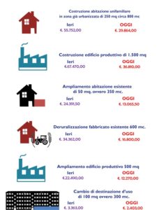 Grazie al dimezzamento degli oneri di urbanizzazione, quindi, ad esempio la costruzione di un’abitazione unifamiliare in zona già urbanizzata di 250 mq (circa) ovvero 800 metri cubi passerà da 55.752 mila euro a 29.864 euro; la costruzione di un edificio produttivo di circa 1.500 mq passerà da 67.470 a 36.810 euro; l’ampliamento di un’abitazione esistente di 50 mq ovvero 350 metri cubi passerà da 24.391 euro a 13.065 euro; la deruralizzazione di un fabbricato esistente (600 mc) passerà da 34.362 a 16.800; l’ampliamento di un edificio produttivo (500 mq) passerà da 22.490 euro a 12.270 euro e cambi di destinazione d’uso su un taglio medio di circa 100 mq ovvero 300 metri cubi passerà da 3363 a 2403 euro.