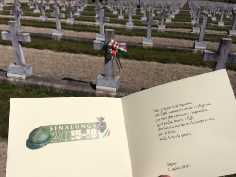 L’occasione di questo viaggio è stata colta dal Comune di Sinalunga anche per commemorare i quattro caduti sinalunghesi nelle battaglie sul fronte occidentale nella Grande Guerra. Un grande cimitero militare, nel comune di Chambrecy, accoglie i corpi di 5 mila soldati italiani che difesero quella regione dall’attacco tedesco negli anni 1917 e 1918. Fanti, garibaldini, artiglieri: giovani italiani che persero la vita nella strenua difesa della libertà dei popoli. Federico Biancucci di Ferdinando classe 1896; Pietro Falciani di Angelo classe 1884; Nello Franci di Adolfo, classe 1887; Eugenio Palmerini di Costantino classe 1880; questi i giovani sinalunghesi che, nel centenario della Grande Guerra hanno ricevuto l’omaggio del Comune di Sinalunga. Una coccarda tricolore per ognuno di loro ed una corona d’alloro deposta sull’altare che sorge al centro del cimitero miliare: questi i segni di riconoscimento che l’assessore Emma Licciano ha lasciato nel cimitero militare di Bligny, lo scorso 2 luglio. Insieme a lei l’assessore Paolo Oliviero, il sindaco di Ay, Dominique Lévêque che ha voluto deporre un cesto di fiori accanto alla corona di alloro italiana, Claude Simon vice sindaco di Hutvillers e David locatelli vice sindaco di Chambrecy.
