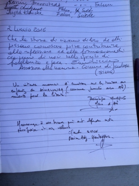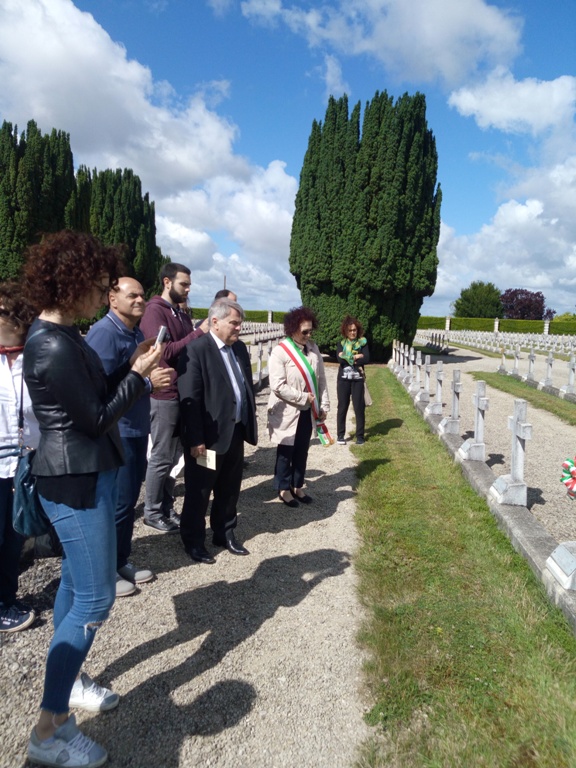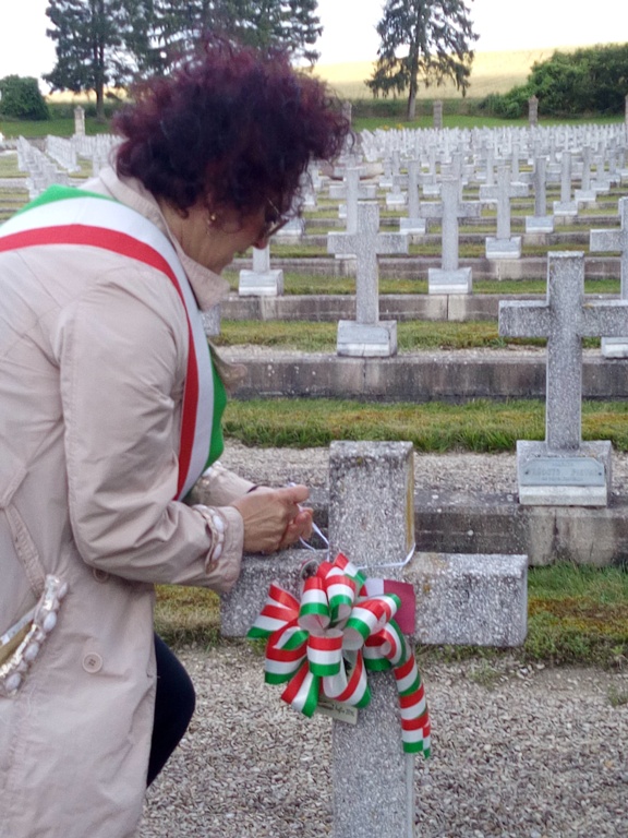 L’occasione di questo viaggio è stata colta dal Comune di Sinalunga anche per commemorare i quattro caduti sinalunghesi nelle battaglie sul fronte occidentale nella Grande Guerra. Un grande cimitero militare, nel comune di Chambrecy, accoglie i corpi di 5 mila soldati italiani che difesero quella regione dall’attacco tedesco negli anni 1917 e 1918. Fanti, garibaldini, artiglieri: giovani italiani che persero la vita nella strenua difesa della libertà dei popoli. Federico Biancucci di Ferdinando classe 1896; Pietro Falciani di Angelo classe 1884; Nello Franci di Adolfo, classe 1887; Eugenio Palmerini di Costantino classe 1880; questi i giovani sinalunghesi che, nel centenario della Grande Guerra hanno ricevuto l’omaggio del Comune di Sinalunga. Una coccarda tricolore per ognuno di loro ed una corona d’alloro deposta sull’altare che sorge al centro del cimitero miliare: questi i segni di riconoscimento che l’assessore Emma Licciano ha lasciato nel cimitero militare di Bligny, lo scorso 2 luglio. Insieme a lei l’assessore Paolo Oliviero, il sindaco di Ay, Dominique Lévêque che ha voluto deporre un cesto di fiori accanto alla corona di alloro italiana, Claude Simon vice sindaco di Hutvillers e David locatelli vice sindaco di Chambrecy.