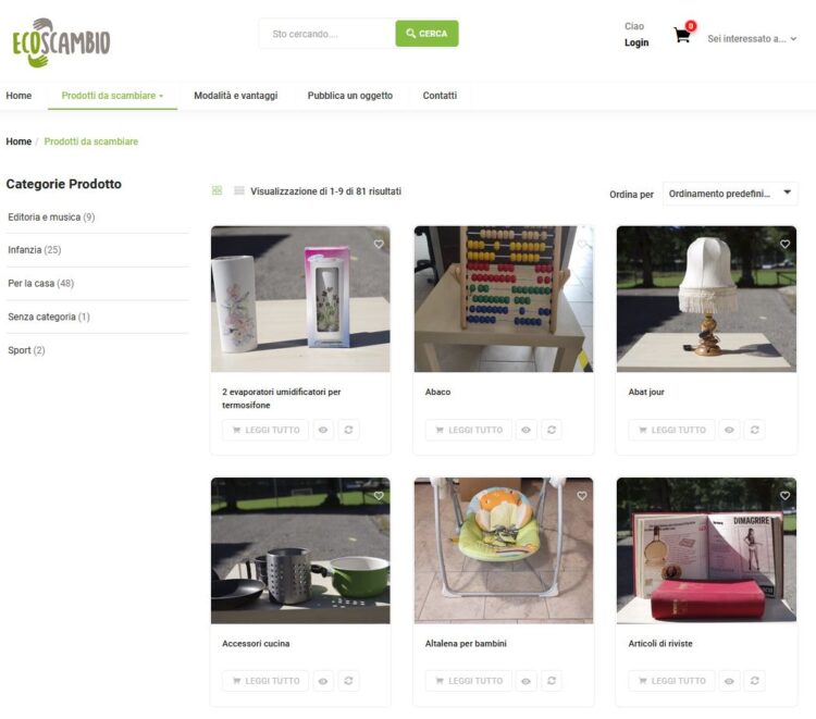 Ed è proprio all’attenzione verso uno dei principi cardine cui si ispira la direttiva europea sull’economia circolare, la riduzione dei rifiuti e il loro riutilizzo, al quale fa riferimento il progetto. L’interazione e lo scambio avvengono in duplice modalità: l’Ecoscambio è infatti un luogo fisico, la struttura di via dei Nocini, che è stata recentemente oggetto di riqualificazione ambientale, aperta il sabato dalle 9 alle 13 e dalle 14 alle 16,30. Ma è anche uno spazio virtuale, con il sito www.ecoscambiosovicille.it. Sul portale vengono caricati costantemente tutti gli oggetti disponibili, catalogati, con relative immagini, per tipologia e genere.