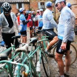 MURLO. L’Eroica ha transitato per la prima volta dal castello di Murlo, oggi (4 Ottobre), dove è stata effettuata anche la timbratura dei roadbook. Si è trattato di un evento nell’evento. Tant’è che gli abitanti, gli amministratori comunali e il sindaco Fabiola Parenti hanno accolto i partecipanti in abito medievale, compreso quello raffigurante il vescovo, che qui aveva la sede del feudo (senza dimenticare le origine etrusche del luogo). In precedenza, il mitico evento ciclistico passava da Vescovado e proseguiva verso Montalcino, senza toccare il castello. Fabiola Parenti, appena eletta, ha subito chiesto agli organizzatori di inserire un luogo così ricco di storia nel circuito, ripristinando una strada che ha consentito l’uscita dei ciclisti, dopo l’entrata dalla porta principale. L’Eroica, da quest’anno, ha un altro punto di riferimento, e Murlo ha colto un’altra occasione per inserirsi nei circuiti importanti, per una sua valorizzazione. Centinaia di “eroici” hanno animato le piazze del castello, si sono rifocillati, hanno timbrato il loro roadbook. Nonostante la pioggia intermittente, si è trattato di una novità molto apprezzata da chi ha avuto, nella sosta di una lunga pedalata, la possibilità di ammirare questo piccolo centro, che accoglie un grande museo archeologico.