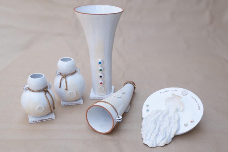 Le due Brocche de’ Citti, si ispirano alla tradizionale borraccia del pellegrino, ricavata dalla zucca, che permetteva una scorta d’acqua per la tappa di cammino sufficiente fino alla prossima fonte. In queste due brocche e in quella a forma di corno degli Alfieri, i colori dei quartieri sono punteggiati in una sorta di piccoli anelli in cui passano delle corde di bronzo, sia l’anello che la corda sono simboli del legame affettivo e rappresentano i saldi vincoli di amicizia che si annodano nel cammino della vita con le persone della propria comunità di appartenenza. La scelta del colore bianco richiama il processo di purificazione spirituale che il pellegrinaggio inaugura: purificazione che si fa ospitale della memoria di tutti gli altri colori. Per me è anche il ricordo affettuoso di un amico, lo scultore Andrea Fagioli, che nel 2017 ha scelto di realizzare le brocche del Barbarossa smaltandole interamente di bianco. Al bianco si accosta il color crema delle pennellate, a cui ho affidato la distinzione fra le brocche degli alfieri e quelle degli arcieri. Quelle degli arcieri sono segnate da una pennellata dritta come la traiettoria della freccia, che va dritta al centro alla meta per la via più breve e diretta. Quelle degli alfieri sono pennellate avvolgenti che si muovono in tutte le direzioni come le bandiere, e suggeriscono le variazioni di percorso, gli imprevisti, che lungo il cammino possono riservare le sorprese più promettenti. Il pellegrinaggio è caratterizzato dalla contemporaneità dei due movimenti, la scelta del percorso più diretto per raggiungere la prossima meta e l’apertura all’imprevisto, al cambiamento di programma. Infine, per il premio Orfeo, destinato al miglior corteo, ho scelto di mettere al centro del piatto la conchiglia, che è il simbolo più tipico del pellegrino, che segna il percorso per non perdersi e con cui si attingeva acqua alla fonte. Qui non si tratta di un’acqua di scorta, ma di un’acqua fresca, che sgorga dalla fonte: in fondo il vero scopo del pellegrinaggio è arrivare alla fonte dell’acqua viva, a una fonte spirituale che disseta per la vita eterna. Nel premio Orfeo i colori dei quattro quartieri sono dipinti su piccole pietre; è uso comune durante il cammino raccogliere dei sassi più o meno grandi, tenerli con sé, toccarli, caricarli dei propri pensieri e affetti. Scegliendo di dipingerci sopra il colore dei quattro Quartieri, esprimono un senso di appartenenza alla comunità di origine che accompagna il cammino anche nella lontananza e si carica di memoria e di affetto. Inoltre, in ognuno dei premi, il logo del Barbarossa, con l’imperatore a cavallo, ci ricorda che anche lui è stato pellegrino verso Roma. Concludo evidenziando che nelle simbologie dei cinque premi sono richiamate le varie cinque dimensioni del creato: il mondo animale di terra nel corno, quello di mare nella conchiglia, il mondo vegetale nelle zucche, il mondo minerale nel metallo della tromba e nelle pietre. Nel pellegrinaggio ci si trova immersi nella natura, riconciliati nelle varie parti di noi, unificati, ci scopriamo semplici, mendicanti, pieni di stupore per una realtà che si apre a noi nella misura in cui camminiamo, ben oltre la tappa che conclude il nostro pellegrinaggio. Parti disgregato e ti leghi sempre più a tutto lungo il cammino, si scopre nel camminare insieme del nostro corpo e della nostra anima, la natura spirituale del nostro corpo e nella semplicità, spesso si vive un’esperienza di radicale trasformazione di sé. Questo è il mio augurio per tutti voi”.